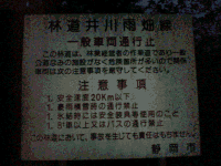 「井川雨畑林道を御通行中の皆様」と丁寧な書き方になっているのは,(信じがたいですが)この先にも集落があり,この林道が生活道路になっているからです.(私が走っていたときも,地元車両の方と何回か離合しました)