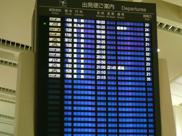 私が乗る便ではありませんでしたが,1時間45分遅れで22:45発になっていた便がありました