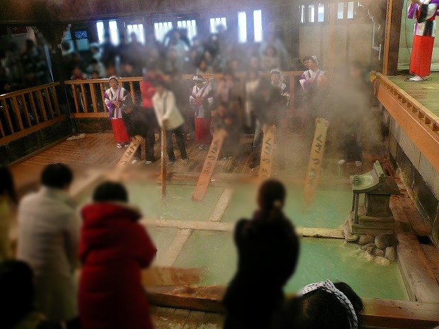 湯畑の源泉は90度以上あり,水で薄めて温度を下げると効能も下がるため,お湯の温度を自然に下げるのと準備運動のために湯もみをするんだそうです.