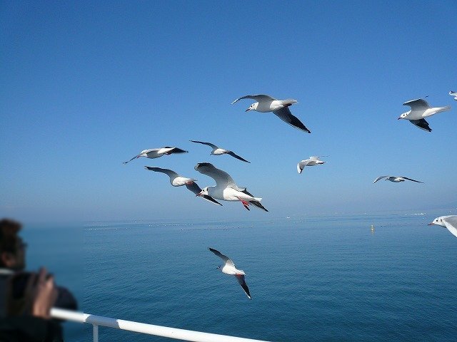 止まっているように見えますが、カモメはフェリーと同じ速度で飛んでいます
